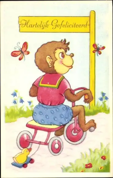 Ak Glückwunsch, Affe fährt Dreirad, Schmetterlinge