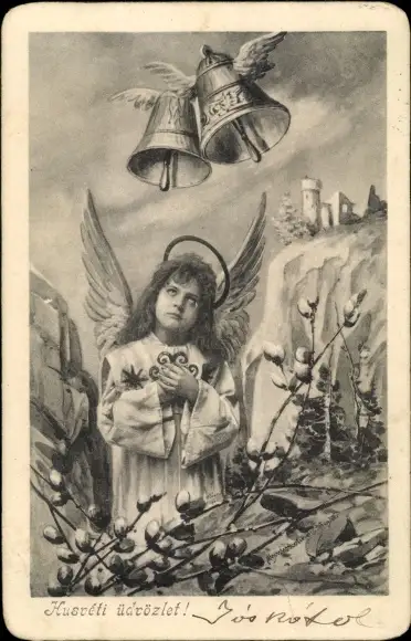 Ak Glückwunsch, Engel beim Beten, Fliegende Glocken, Weidenkätzchen