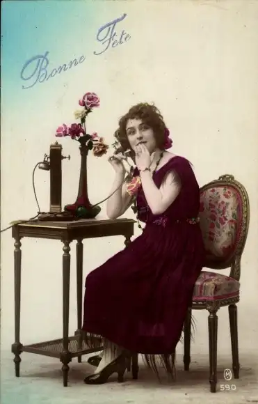 Ak Glückwunsch, Frau am Telefon, Blumenstrauß