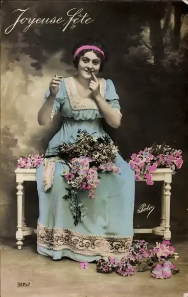 Ak Glückwunsch, Frau in blauem Kleid, Blumen, Sitzbank