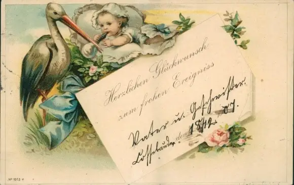 Ak Glückwunsch Geburt, Storch, Baby, Blumen
