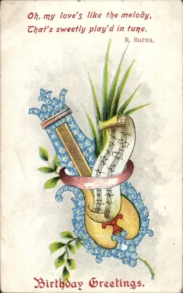 Ak Glückwunsch Geburtstag, Blumen, Laute, Noten, Zitat von R. Burns