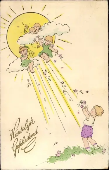 Ak Glückwunsch Geburtstag, Engel werfen Blumen auf ein Kind