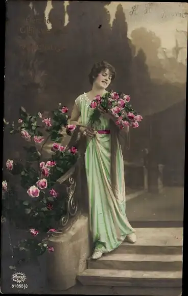 Ak Glückwunsch Geburtstag, Frau mit Blumenstrauß