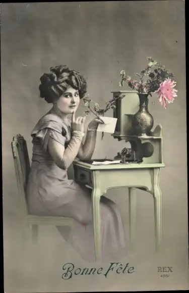 Ak Glückwunsch Geburtstag, Frau mit Brief, Blumenstrauß