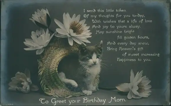 Ak Glückwunsch Geburtstag, Katze, Blumen, Korb