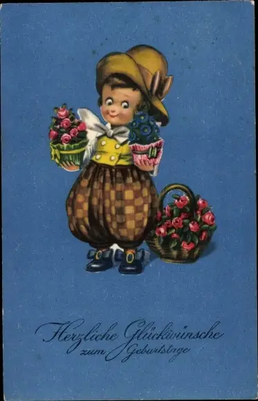 Ak Glückwunsch Geburtstag, Kind mit Blumenkorb, Blumentöpfe
