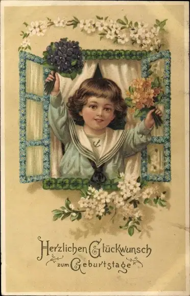 Ak Glückwunsch Geburtstag, Kind mit Blumensträußen am Fenster