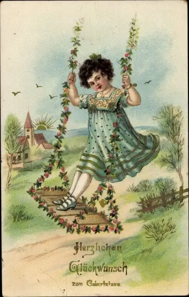 Ak Glückwunsch Geburtstag, Mädchen beim Schaukeln, Blumen