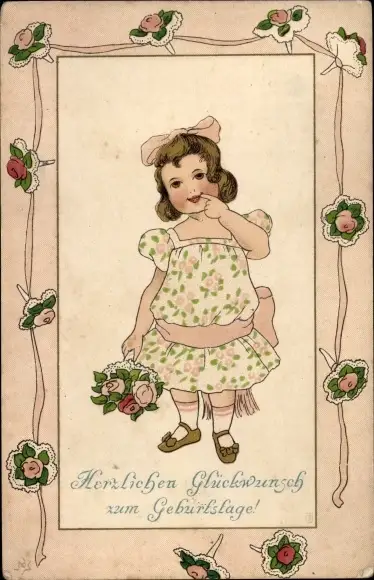 Ak Glückwunsch Geburtstag, Mädchen mit Blumenstrauß, Rosen