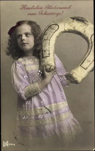 Ak Glückwunsch Geburtstag, Mädchen mit großem Hufeisen