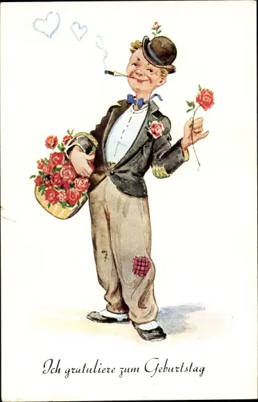 Ak Glückwunsch Geburtstag, Mann mit Blumenkorb, Zigarette