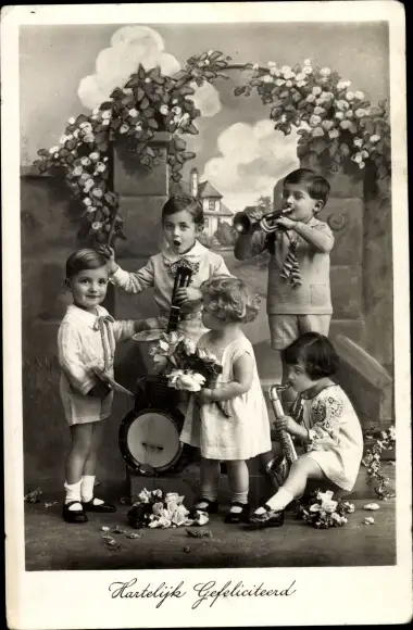 Ak Glückwunsch Geburtstag, Musizierende Kinder, Blumen