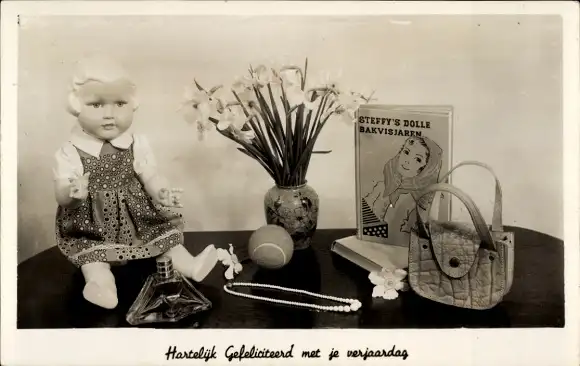 Ak Glückwunsch Geburtstag, Schildkröt-Puppe, Blumenstrauß