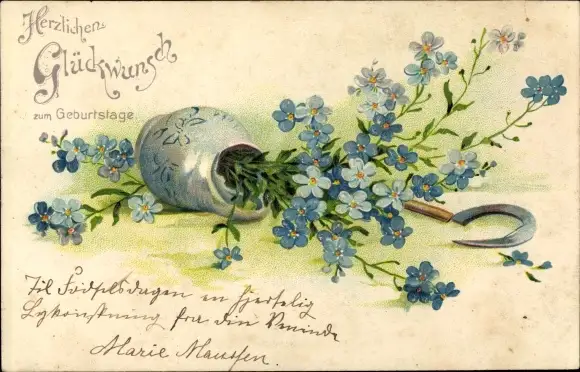 Ak Glückwunsch, Geburtstag, Vergissmeinnicht, Zerbrochene Vase, Sichel