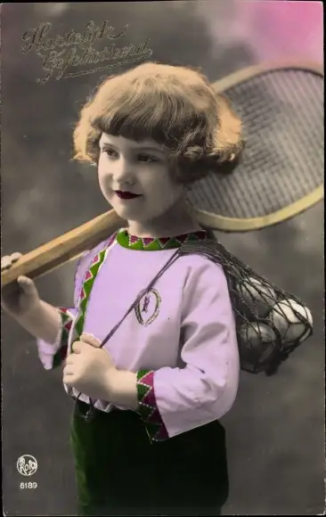 Ak Glückwunsch, Hartelijk Gefeliciteerd, Kind mit Tennisschläger, Tennisbälle