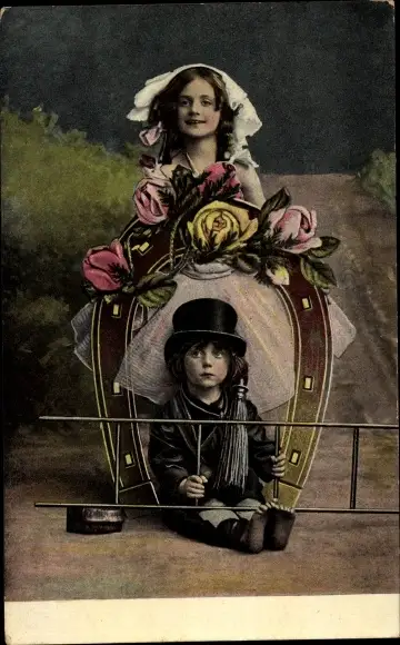 Ak Glückwunsch, Junge als Schornsteinfeger, Hufeisen, Mädchen