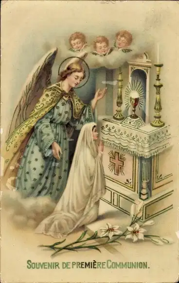 Ak Glückwunsch Kommunion, Betendes Kind, Engel, Altar