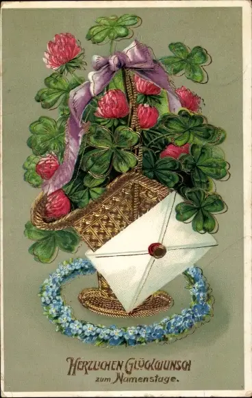 Ak Glückwunsch Namenstag, Brief, Glücksklee, Vergissmeinnicht