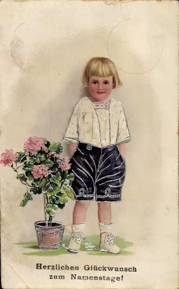 Ak Glückwunsch Namenstag, Kind, Blumen, Blumentopf