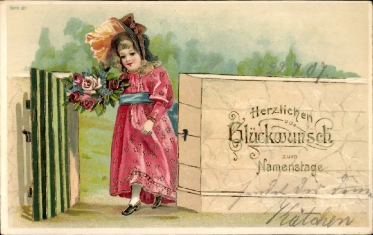 Ak Glückwunsch Namenstag, Mädchen mit Blumenstrauß