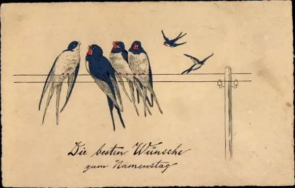 Ak Glückwunsch Namenstag, Schwalben, Hochspannungsleitung