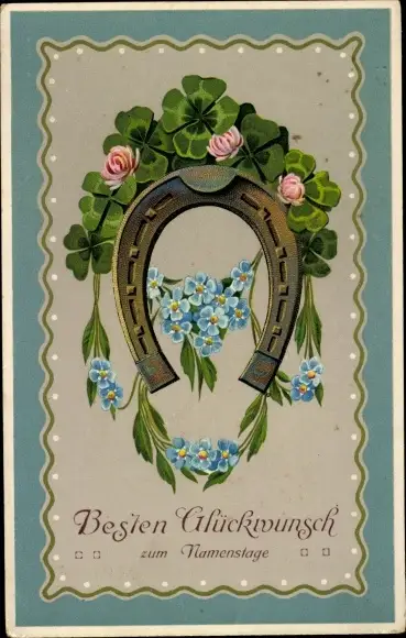 Ak Glückwunsch Namenstag, Vergissmeinnicht, Hufeisen, Glücksklee