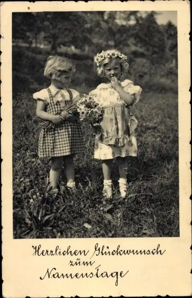 Ak Glückwunsch Namenstag, Zwei Mädchen auf einer Wiese
