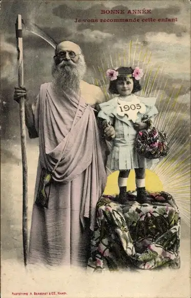 Ak Glückwunsch Neujahr 1905, Altes Jahr mit Sense, Mädchen mit Handtasche