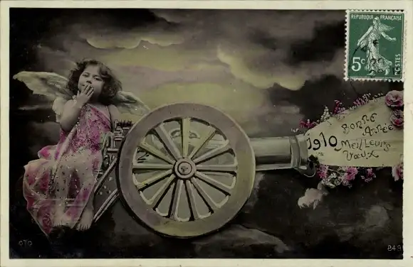 Ak Glückwunsch Neujahr 1910, Engel, Kanone, Blumen