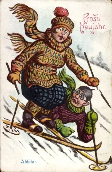 Ak Glückwunsch Neujahr, Abfahrt, Frau auf Skiern, gestürzter Mann
