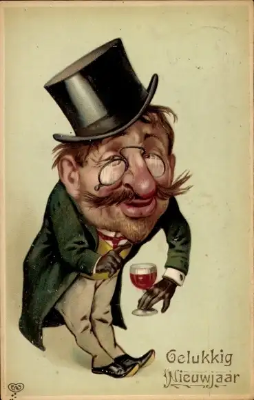 Ak Glückwunsch Neujahr, Betrunkener Mann mit Weinglas