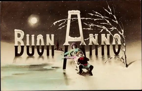 Ak Glückwunsch Neujahr, Buon Anno, Kinder auf einem Schlitten im Mondschein
