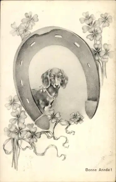 Ak Glückwunsch Neujahr, Dackel, Glücksklee, Hufeisen