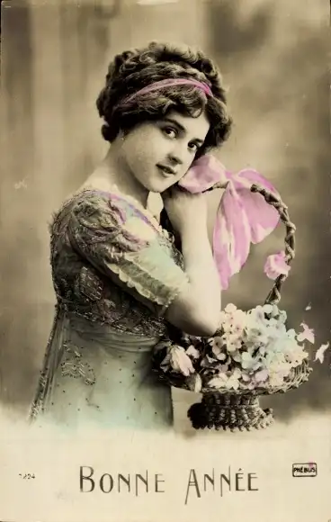 Ak Glückwunsch Neujahr, Dame mit Blumenkorb