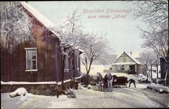 Ak Glückwunsch Neujahr, Dorfpartie, Schlittengespann