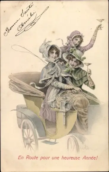 Ak Glückwunsch Neujahr, Drei Frauen auf einer Kutsche
