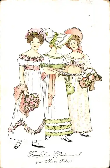 Ak Glückwunsch Neujahr, Drei junge Frauen in eleganten Kleidern