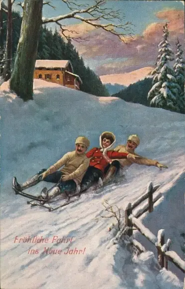 Ak Glückwunsch Neujahr, Dreier Schlitten, Wintersport, Abfahrt, Männer, Frau