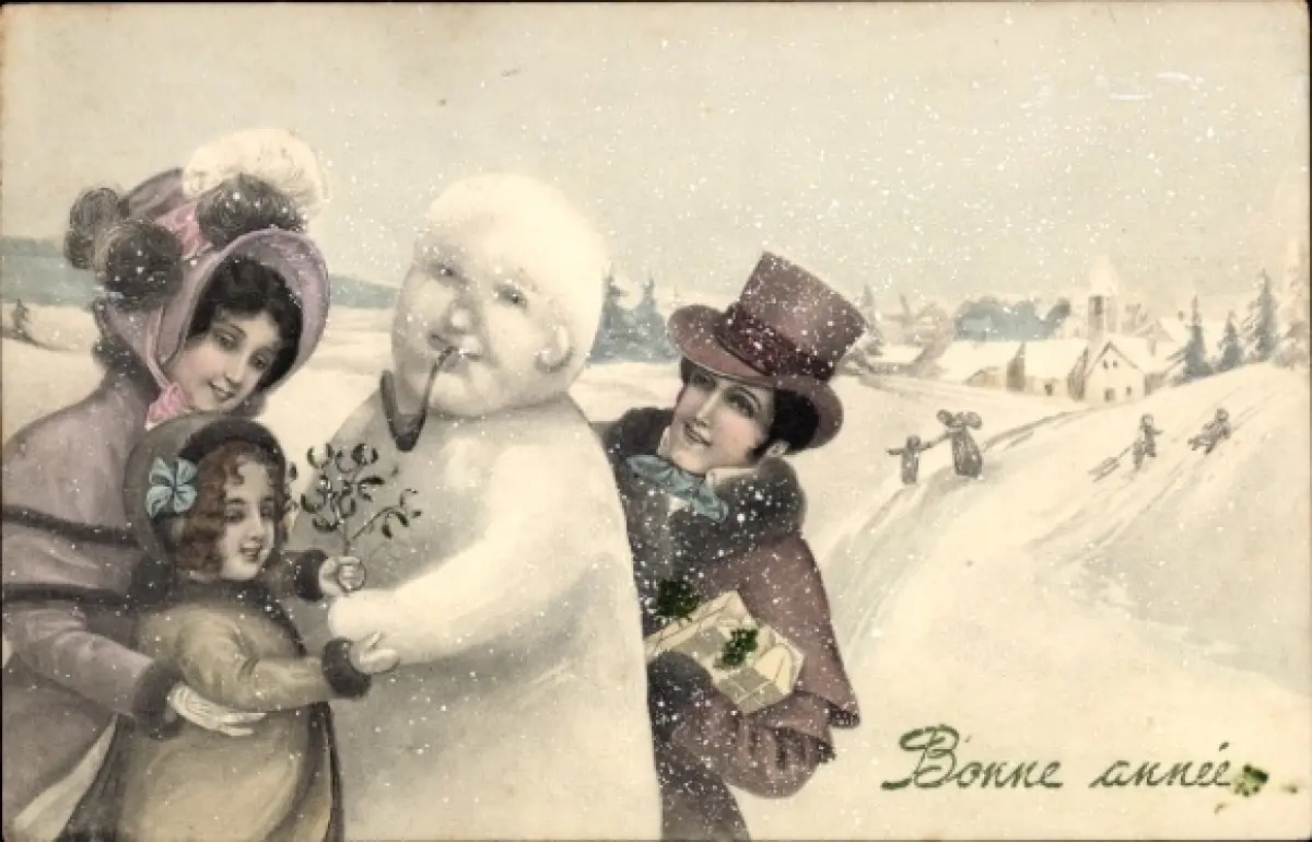 Ak Glückwunsch Neujahr, Eltern, Kind, Schneemann, Mistelzweige
