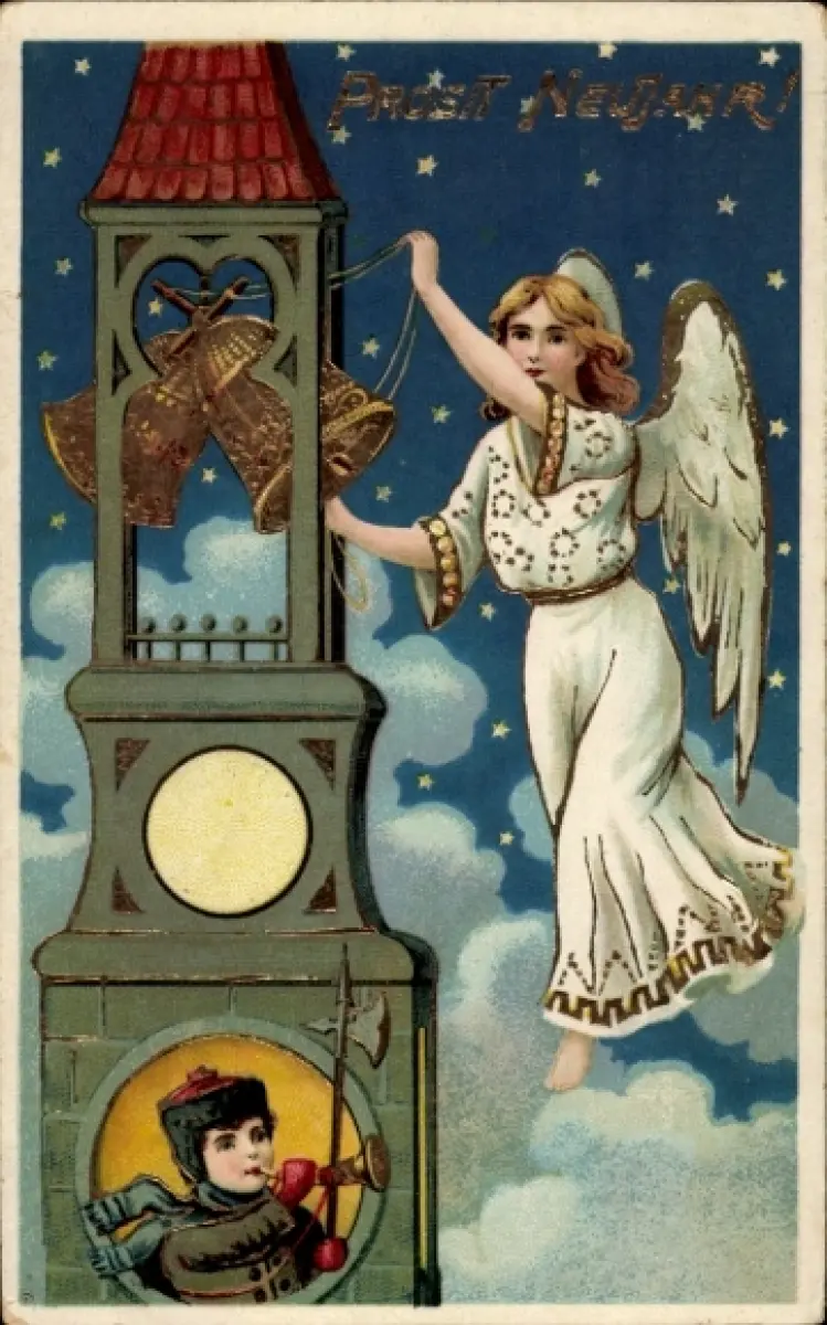 Ak Glückwunsch Neujahr, Engel, Glocken, Nachtwächter