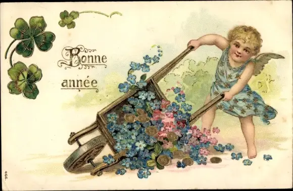 Ak Glückwunsch Neujahr, Engel, Schubkarre, Vergissmeinnicht, Glücksklee