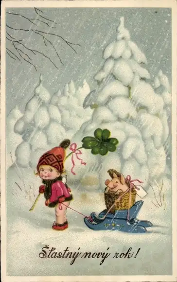 Ak Glückwunsch Neujahr, Engel zieht Schlitten mit einem Schwein