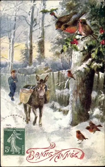Ak Glückwunsch Neujahr, Esel, Junge, Vögel am Baum