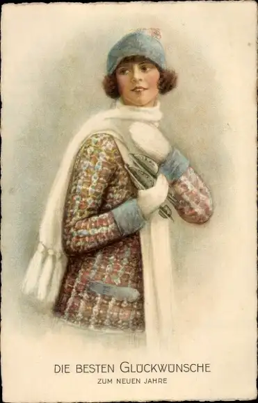 Ak Glückwunsch Neujahr, Frau in Winterkleidung mit Schlittschuhen in der Hand