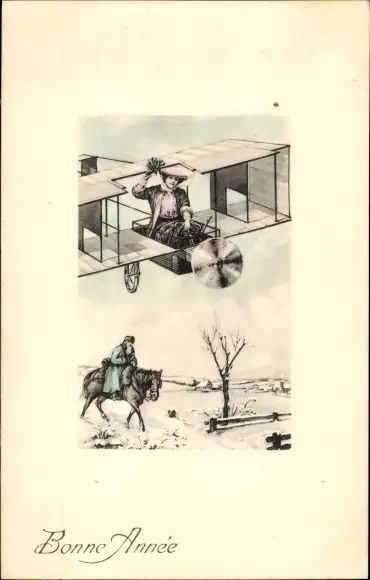 Ak Glückwunsch Neujahr, Frau in einem Doppeldecker, Reiter
