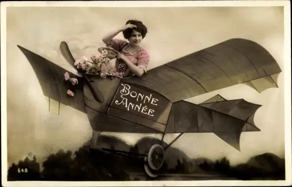 Ak Glückwunsch Neujahr, Frau in einem Fluggerät, Fotomontage