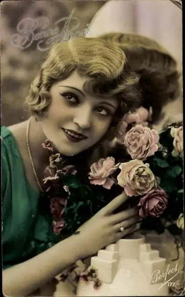 Ak Glückwunsch Neujahr, Frau mit Blumenstrauß, Portrait