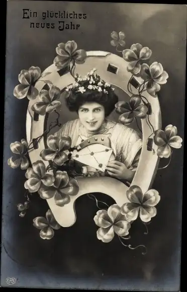 Ak Glückwunsch Neujahr, Frau mit Brief, Hufeisen, Kleeblätter
