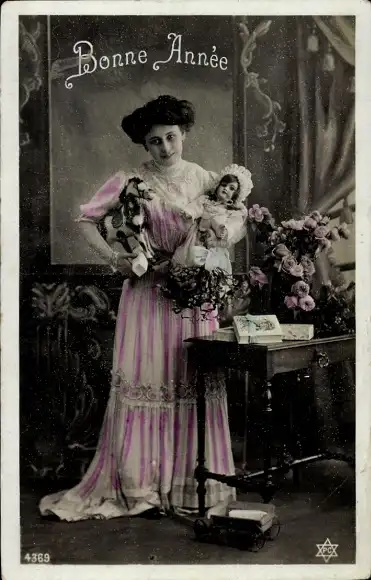 Ak Glückwunsch Neujahr, Frau mit Puppe und Holzpferd